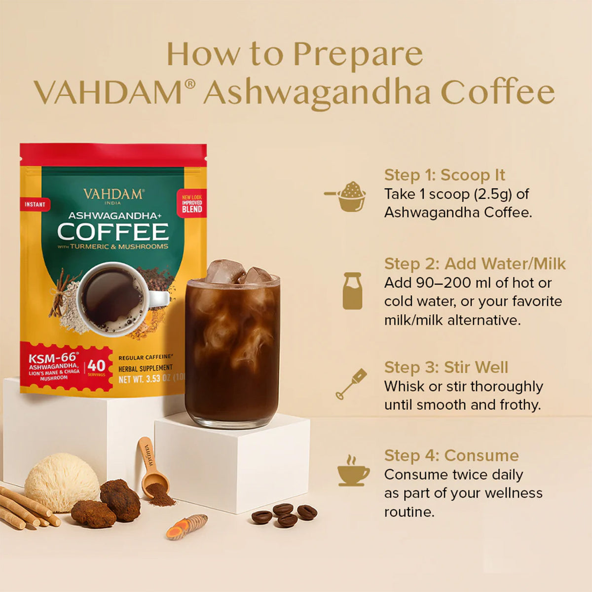 Take 1 scoop (2.5g) of Ashwagandha Coffee.