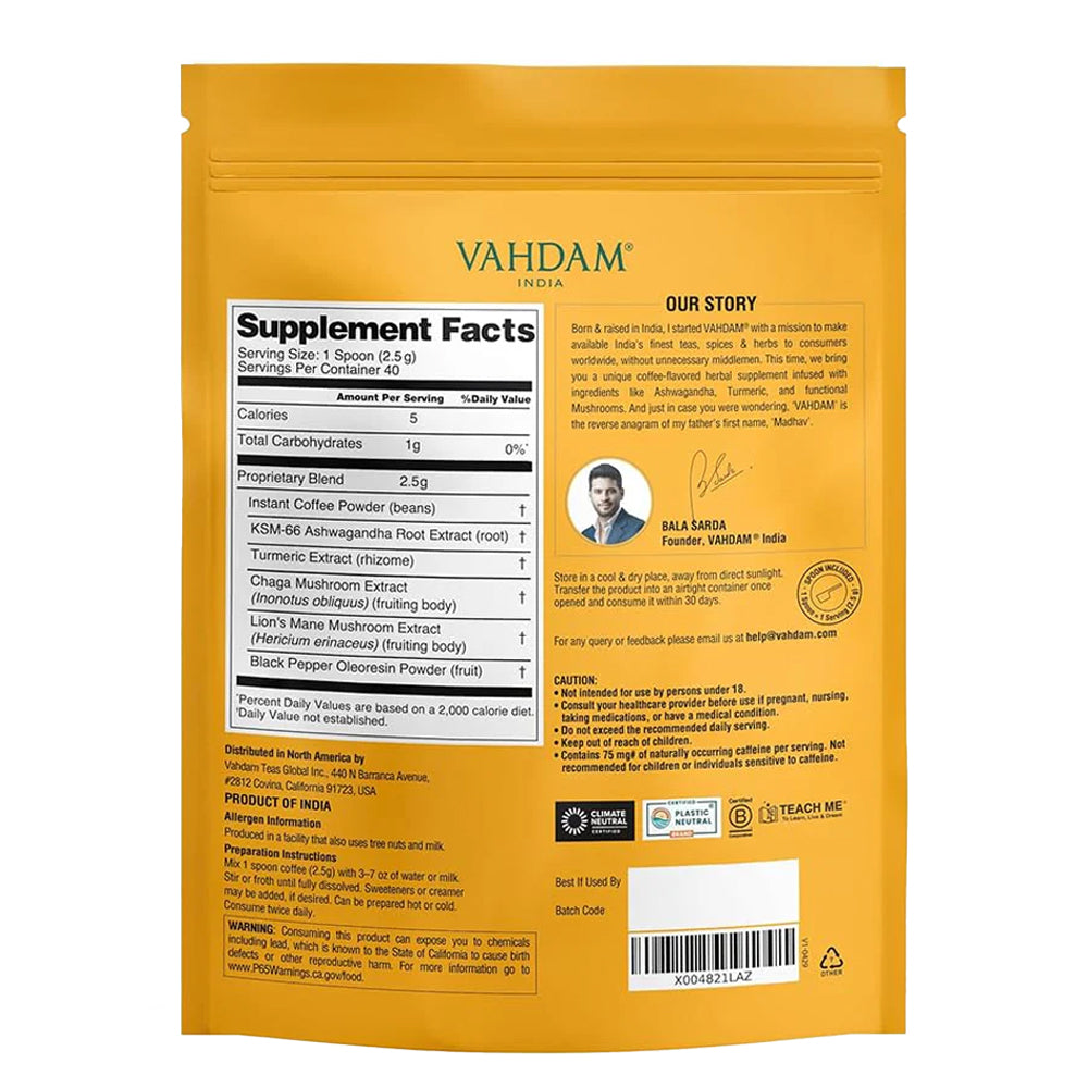 - A functional blend of 100% Arabica coffee infused with KSM-66® Ashwagandha, Turmeric, Lion’s Mane, and Chaga
